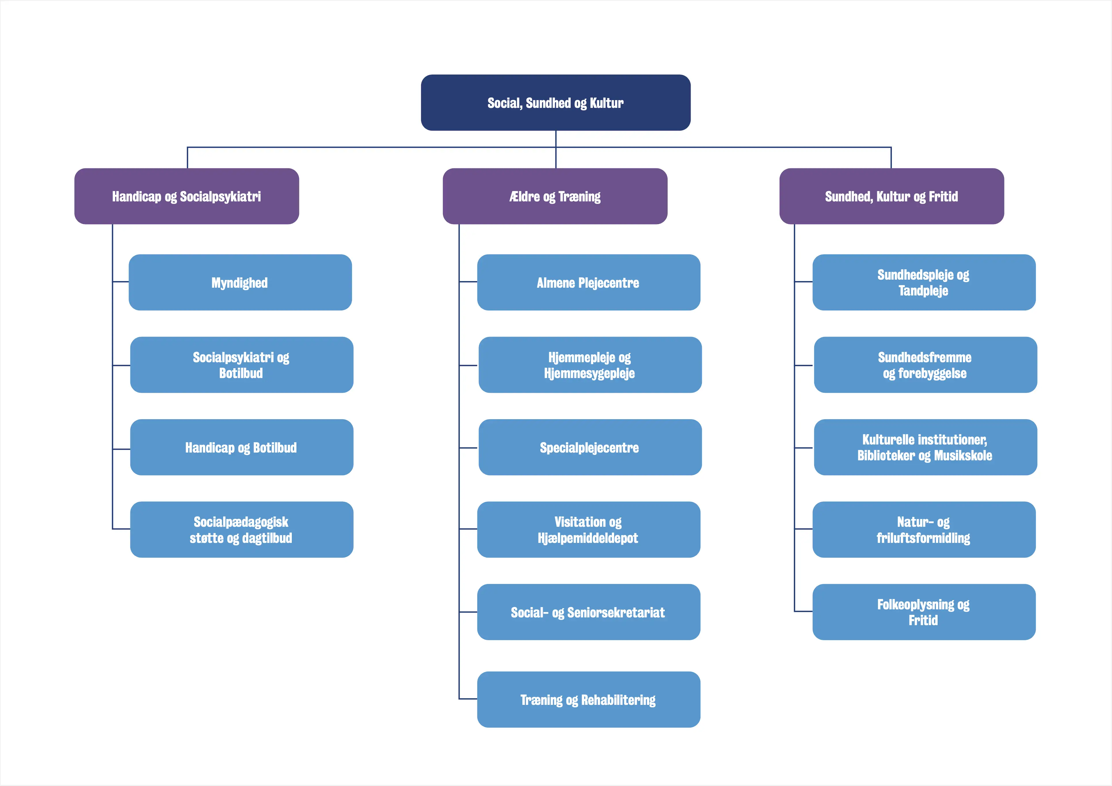 Her på siden kan du se opbygningen af Thisted Kommunes organisation. Under direktionen findes tre forvaltninger, tre centre og en række afdelinger.