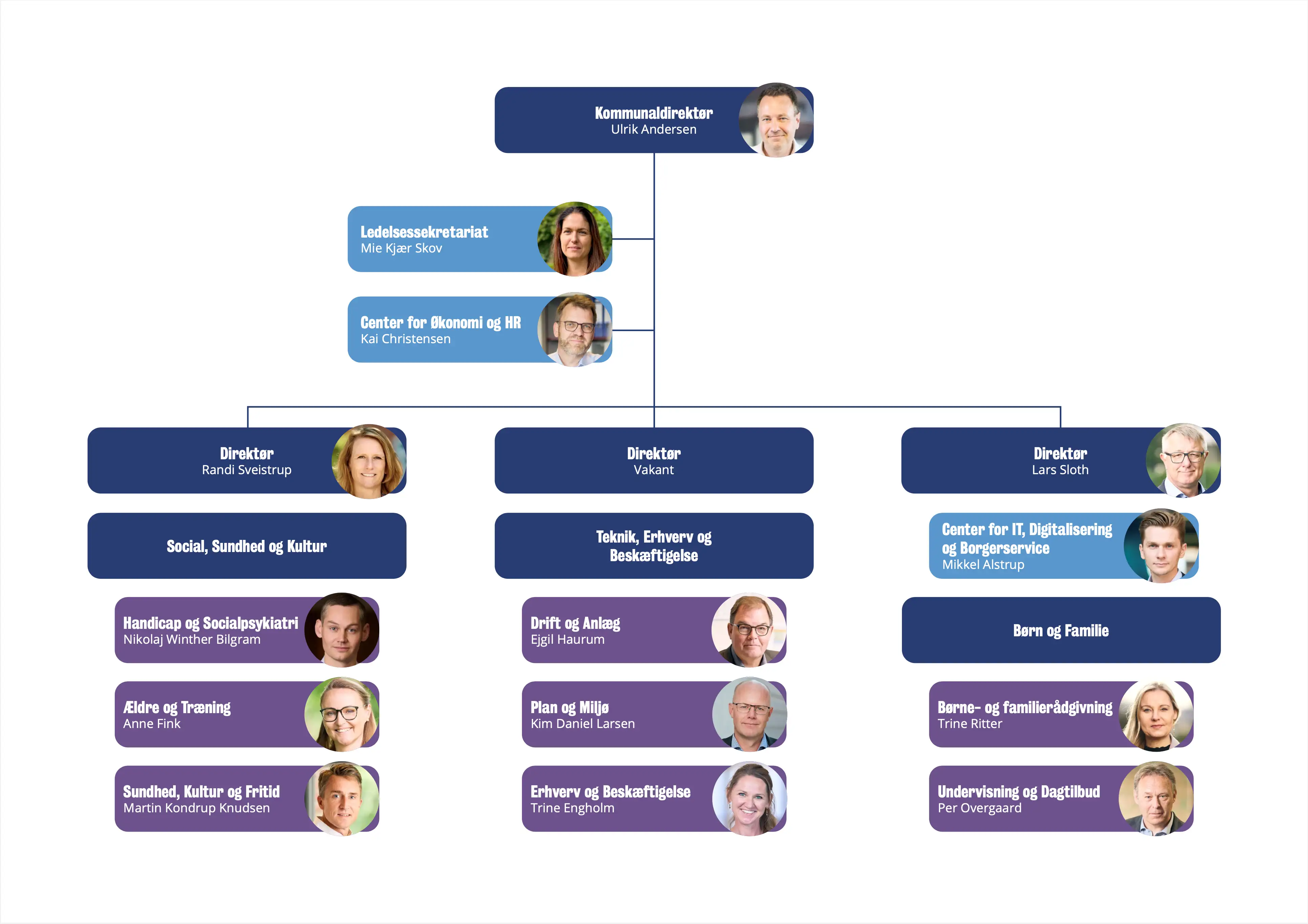 Kan du ikke læse organisationsdiagrammerne her på siden, er du velkommen til at kontakte Ledelsessekretariatet for en nærmere gennemgang. Du finder kontakt-oplysninger her på siden.