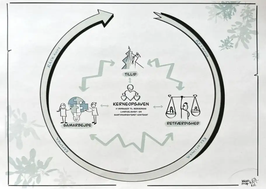 Det betyder, at vi arbejder for at styrke borgerens muligheder for at leve et meningsfuldt liv – med blik for nutidens udfordringer og fremtidens muligheder. Kerneopgaven er ikke blot en formulering, men en fælles retning, der guider vores indsats hver dag.